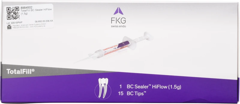 Den høyradiopake og hydrofile TotalFill® BC Sealer HiFlow™ danner Hydroksylapatitt ved herding og inngår en kjemisk binding med dentin og de biokeramisk impregnert Pointa (TotalFill® BC Points). Sammenlignet med TotalFill® BC Sealer™ har TotalFill® BC Sealer HiFlow™ ved oppvarming en lavere viskositet og er røntgenopak. Takket være disse egenskapene er den optimal for varme obturasjonsteknikker. I tillegg kjennetegnes TotalFill® BC Sealer HiFlow™ av en svært høy vedheft og en svært høy biokompatibilitet, og er høyt antibakteriell (+12 pH).