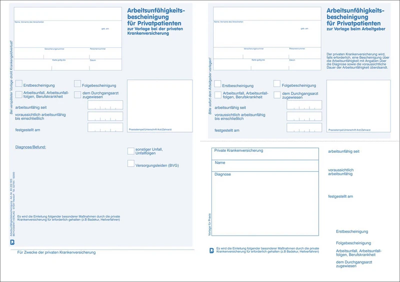 I en moderne praksis er en rettssikker og effektiv dokumentasjon av arbeidsuførhet avgjørende. Arbeidsuførhetserklæring PKV Blå tilbyr en profesjonell løsning for utstedelse av AU-erklæringer for privatforsikrede pasienter.