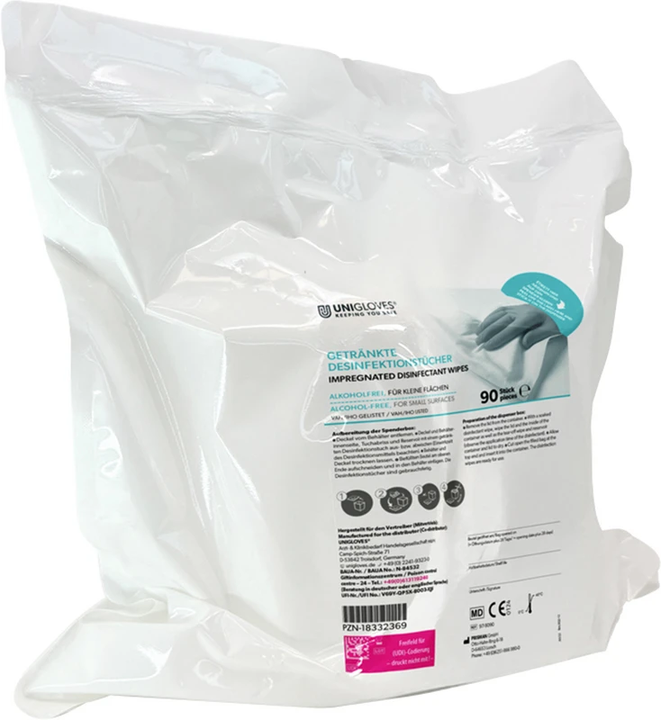 Alkoholfri, bruksklar våtserviett for rengjøring og desinfeksjon av alkoholømfintlige overflater. Det dekkes et omfattende virkningsspektrum mot bakterier, gjær og virus.