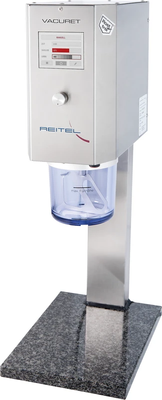 Med den nye VACURET DIGIT blander du pålitelig mange typer gips, innstøpningsmasser, silikoner eller alginater. De tilhørende parameterne programmerer du intuitivt med dreie-trykk-regulatoren, henter dem enkelt opp og starter de valgte innstillingene. For- og hovedblanding med forskjellige hastigheter og tider, med vakuum eller uten, eller med lavt vakuum, gjør at VACURET DIGIT muliggjør nøyaktig tilpasning til materialprodusentens anbefalinger for optimale resultater. 4 tilpassbare standard- samt 24 programmerbare innstillinger setter du enkelt og raskt og kan endres når som helst. Dobbelt filtersystemet beskytter vakuumpumpen mot forurensning dersom en av dine ansatte skulle overfylle en av de høykvalitets rørebeholderne. Den vedlikeholdsfrie og kullbørsteløse langtidsmotoren tillater lengre røringstider og sikrer sammen med den svært høy-kvalitets vakuumpumpen lang levetid for apparatet. Rustfritt stålhus beskytter teknikken mot forurensning og er lett å rengjøre og desinfisere. Dreie- og trykkregulatoren muliggjør sikker betjening selv om hendene ikke er rene. Apparatet leveres med en rørebeholder på 400 ml. Plastbelegget på bechernes innside og utside hindrer at becherne ripes raskt. Røreverkene i rustfritt stål med massivt metallokk er også konstruert for mange års bruk i tannteknisk laboratorium, reduserer kostbare etterfølgende kostnader og beskytter dermed miljøet.