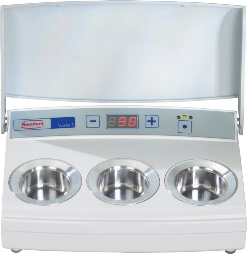 I Vario E varmes modellervokser opp til ideell bearbeidingstemperatur. I stedet for stadig å smelte små porsjoner med modelleringinstrumentet, tas modellervoksen flytende fra Vario E. Dermed sparer du mye tid ved modellering.