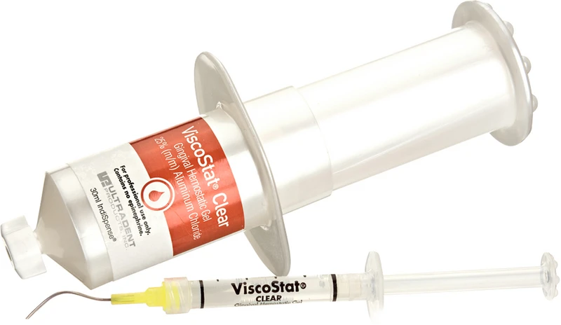 ViscoStat™ Clear er en viskøs, 25 % aluminiumklorid-gel. Virker retraherende og astringerende, effektiv ved lette blødninger. Lukkingen av kapillærender skjer ved en hevelse av kollagenet. Fordel i synlige områder: Det dannes ingen blodkoagler og det er ingen misfarging av harde og myke vev. Med ViscoStat™ Clear anbefales det å gni sulcus eller å mettet Ultrapak™-tråder med det. er en hemostatisk gel med 25 % aluminiumklorid i en viskøs, vannbasert løsning. Den vevsvennlige formelen med silisiumdioksid eliminerer midlertidig mindre blødninger. Det dannes ingen koagulum, og det fester seg ingen rester til prepareringen, noe som er spesielt viktig i den “estetiske sonen”. ViscoStat™ Clear misfarger ikke harde eller myke vev.