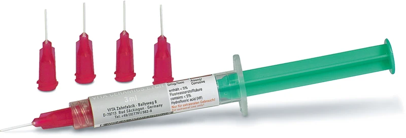 VITA CERAMICS ETCH er en fluorsyregel 5 % for etsning av restaureringer av feltspat-, hybrid- og glasskeramikk. Den resulterende retentive etsestrukturen gir en mikromekanisk forankring mellom keramikk og sementkompositt. Kun beregnet for ekstraoral bruk.