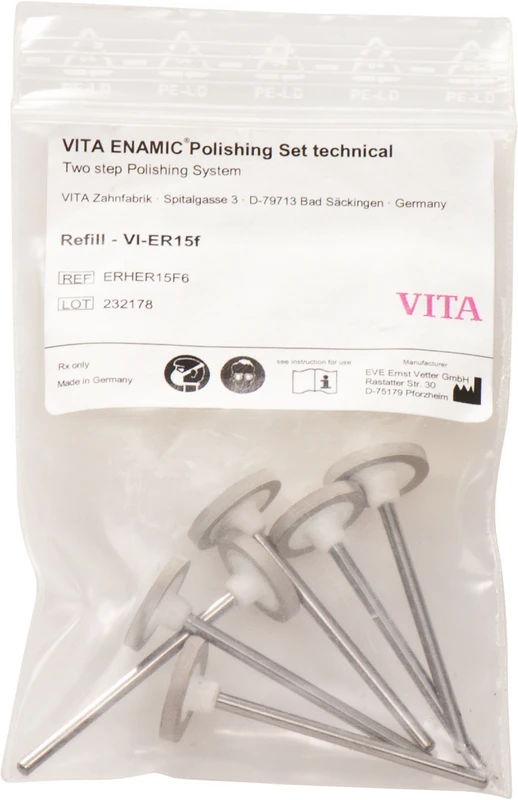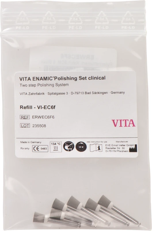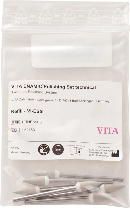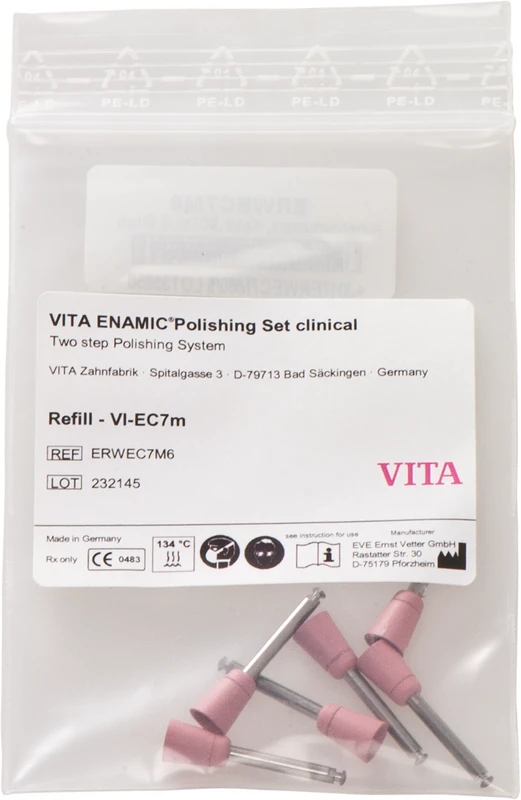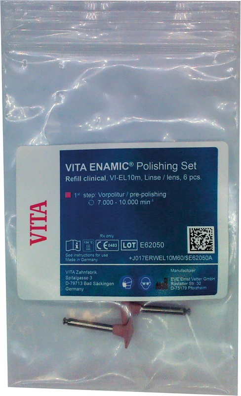 VITA ENAMIC® poleringssett er utviklet for sikker, økonomisk og materialetilpasset overflatebehandling av restaureringer i hybridkeramikk i praksis og laboratorium. Settene inneholder ulike poleringshoder for forpolering og høyglanspolering. Med disse instrumentene kan okklusale flater, kusper, fissurer og kontaktpunkter på restaureringen poleres skånsomt i forhold til materialet. Resultatet er overflater med en utmerket glansgrad.