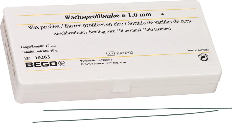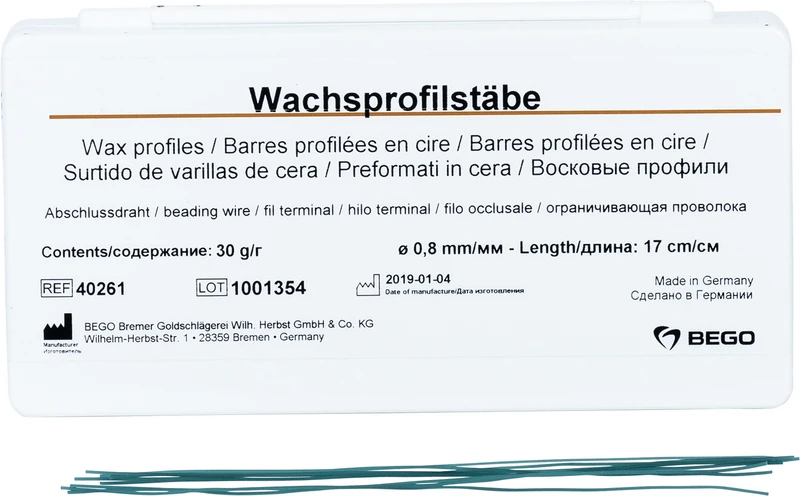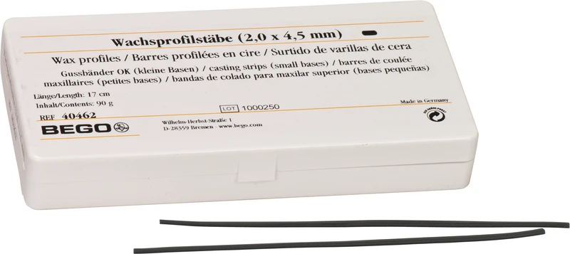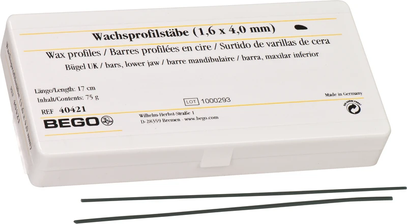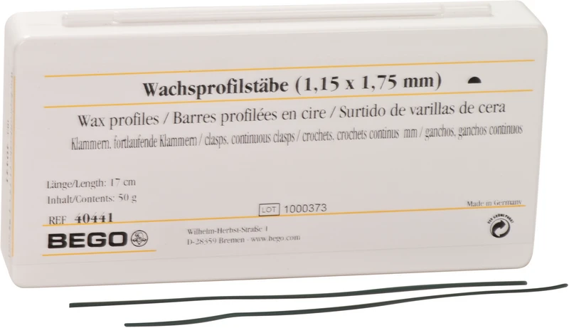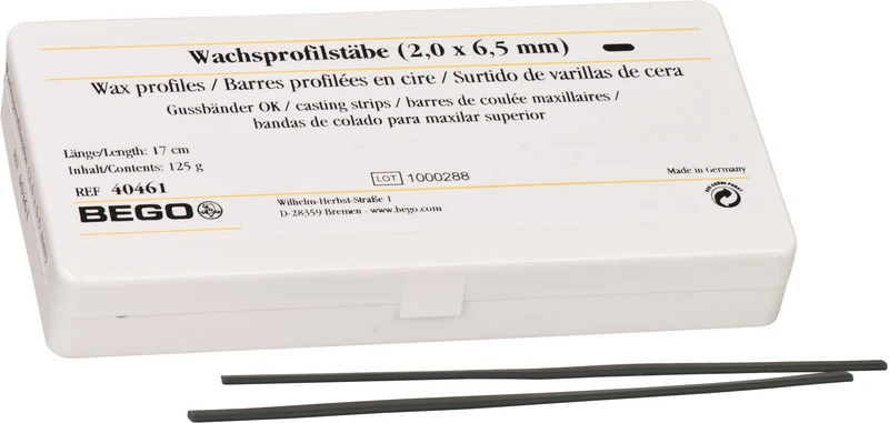 Lett å feste, god vedheft på modellen. Brenner helt ut uten rester. Lengde 17 cm grønn. De velprøvde voksprofilformene gjør enkel modellasjon mulig for en rekke tanntekniske indikasjoner. Voksprofilene er svært formbare og kan enkelt festes på innstøpningsmodell. De gir, på grunn av vokssammensetningen, høy sikkerhet mot utilsiktet deformering og innsnøring ved formgivning.